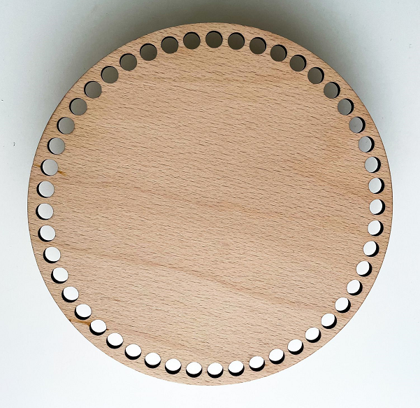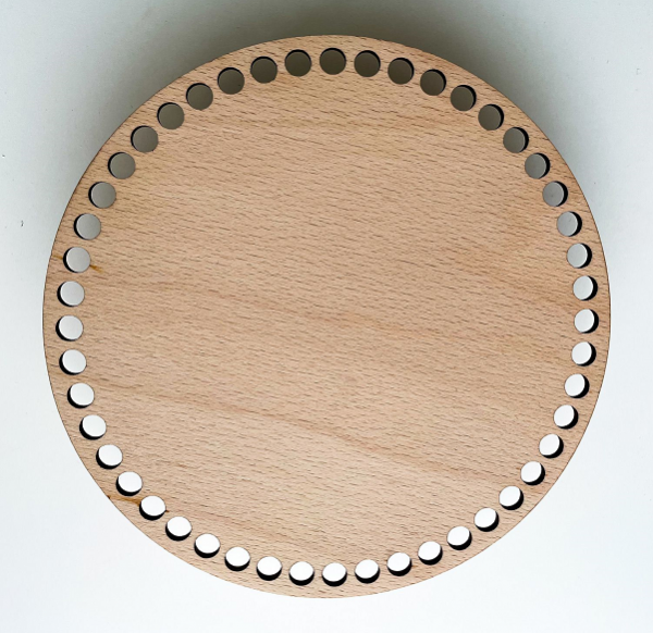 Scopri la base in legno di pioppo di alta qualità, spessore 6 mm, preforata con buchi da 1 cm, progettata per creare cestini e cestoni dal diametro perfetto, senza spreco di filo.