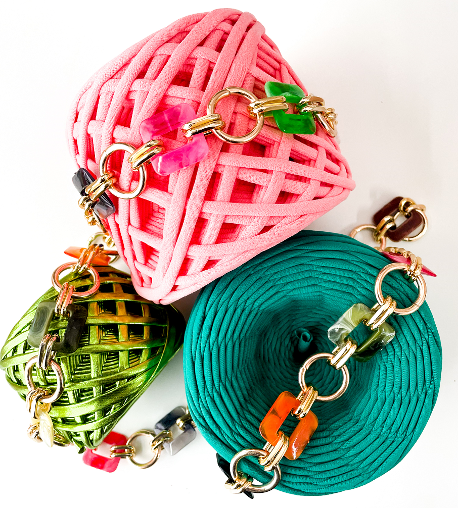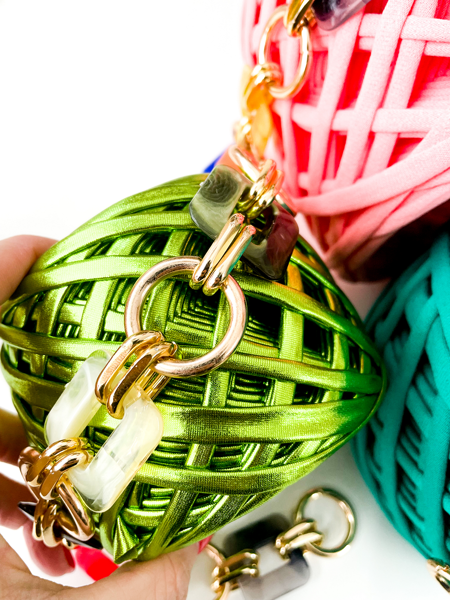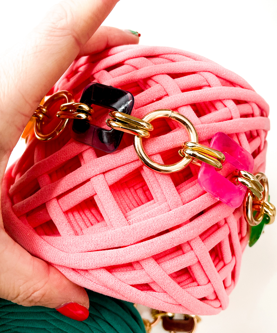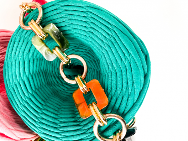 Composto da componenti in resina di 3 cm ciascuno, alternati a moschettoni rotondi con finiture dorate, il manico ha una lunghezza totale di 40 cm.
