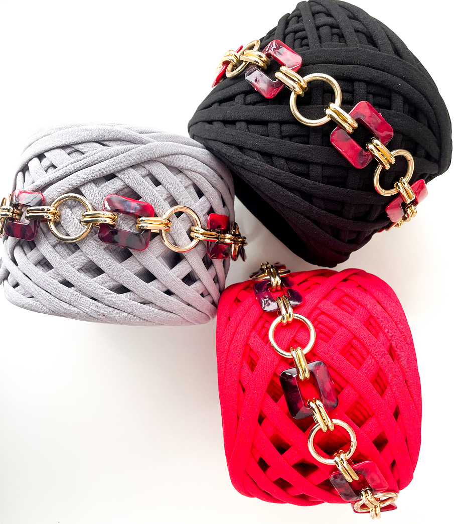 Composto da componenti in resina di 3 cm ciascuno, alternati a moschettoni rotondi con finiture dorate, il manico ha una lunghezza totale di 40 cm.